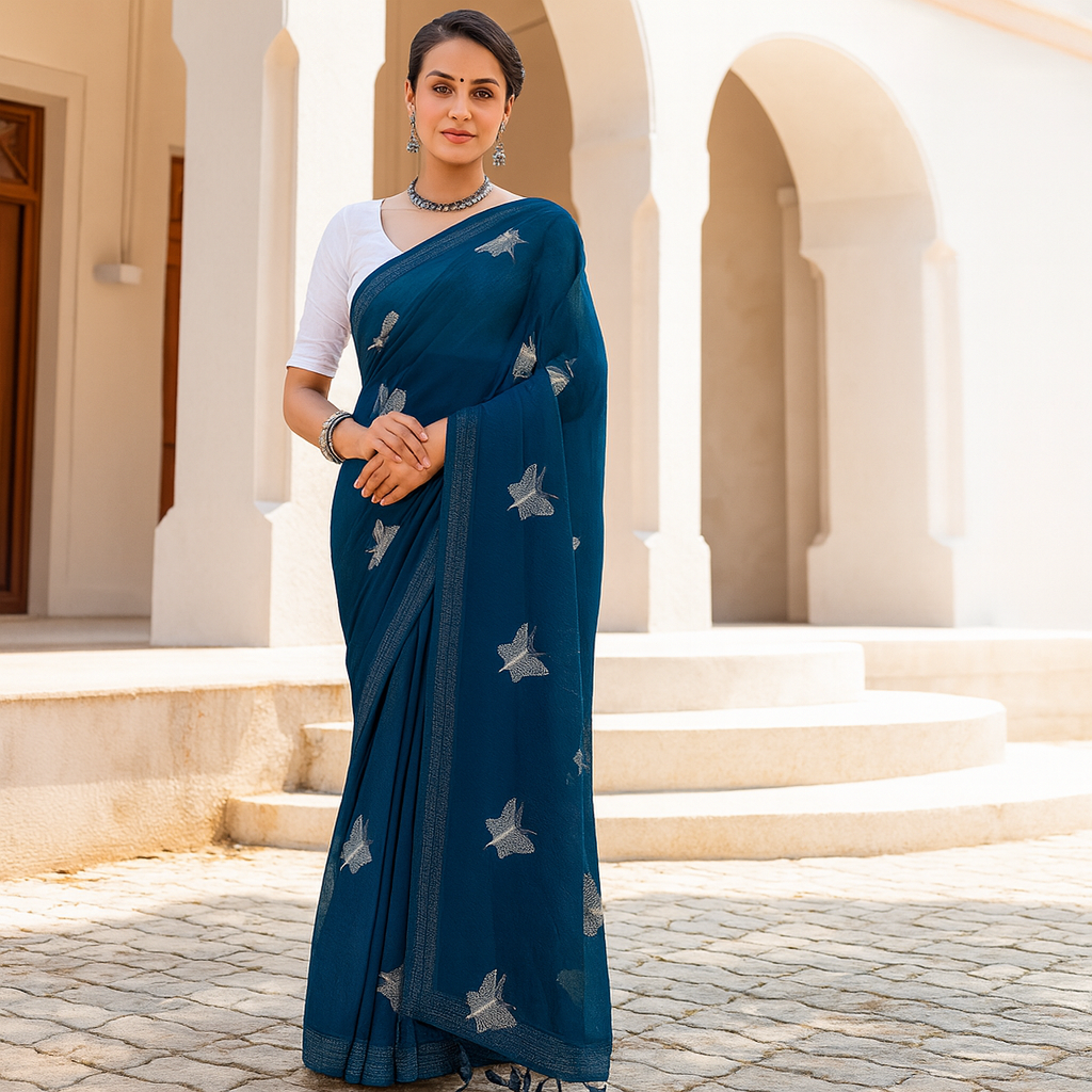 Grace meets simplicity in this elegant teal blue saree adorned with delicate silver star motifs. Crafted from lightweight fabric, it drapes beautifully and offers timeless sophistication. Perfect for festive occasions or graceful everyday wear, this saree blends tradition with modern charm.