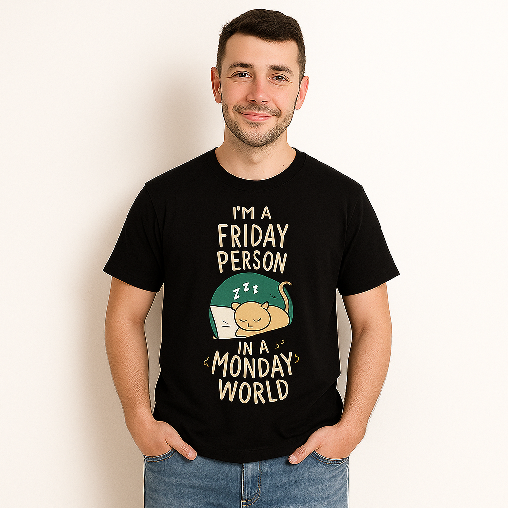 This Men’s Regular Fit T-Shirt in black features a sleek design with "I AM FRIDAY PERSON" printed, ideal for casual wear. Crafted for a comfortable, tailored fit, it balances style and ease for everyday use. Its breathable fabric ensures lasting comfort, making it a versatile addition to your wardrobe.