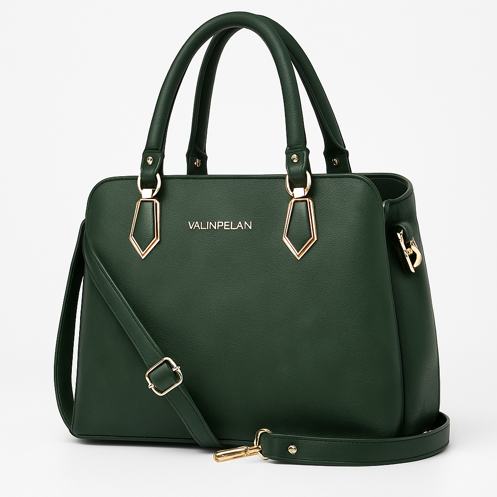 The VALINPELAN Handbag in dark green offers a sophisticated blend of style and utility. Its rich hue enhances its versatility, making it suitable for varied occasions. Designed with quality craftsmanship, this handbag ensures durability and ample space for daily essentials, marrying functionality with elegant design for the discerning user.